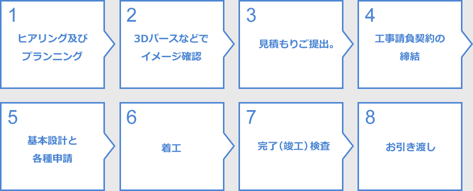 | 引渡し | ・現地にてお立会いのもと行います。 ・工事完了確認書への記名・押印をいただきます。 |